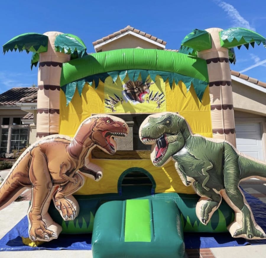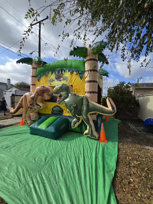 Get ready to bounce back in time with the 13'x13' Dino inflatable! Perfect for parties and events, this dino-themed bounce house offers a prehistoric adventure where kids can jump, laugh, and play surrounded by friendly, colorful dinosaurs. Measuring 13 feet by 13 feet, it’s spacious enough for a group of children to have a roaring good time while staying safe. Easy to set up and guaranteed to bring joy, this bouncy rental will make any event a memorable blast from the past!